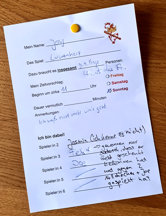 35 Spielerinnen und Spieler! Das verlangt nach einer neuen Regelung, damit unser Con nicht zu voll wird. Das Haus hat begrenzt Betten, der Saal fasst zwar noch mehr Leute, aber irgendwann stehen die Tische zu eng und die Akustik leidet oder die Menschen diffundieren in Nebenräume. In Zukunft heißt es deshalb "first come, first serve" bei der Anmeldung und bei 35 Personen ist Schluss. Sorry!